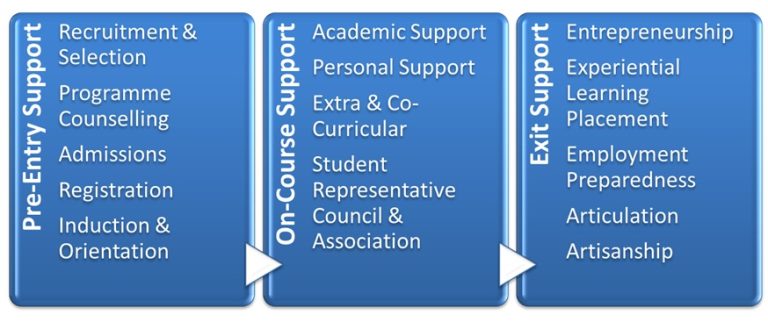 The principle elements of Student Support Services provided to all students at Eastcape Midlands College include Pre-Entry, On-Course and Exit level Support. Therefore,